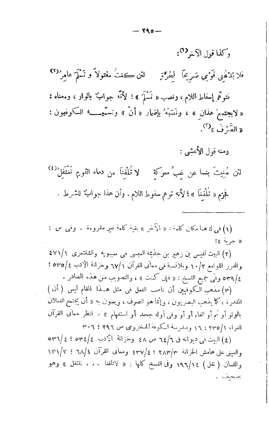 فتوهّم إسقاط اللام، ونصب تَسْلَمَ؛ لأنّه جوابٌ بالواو، ومعناه: لا يجتمعُ هذانِ، ونصَبَهُ بإضمار أنْ وتسمّيه الكوفيون: الصَّرْفَ.