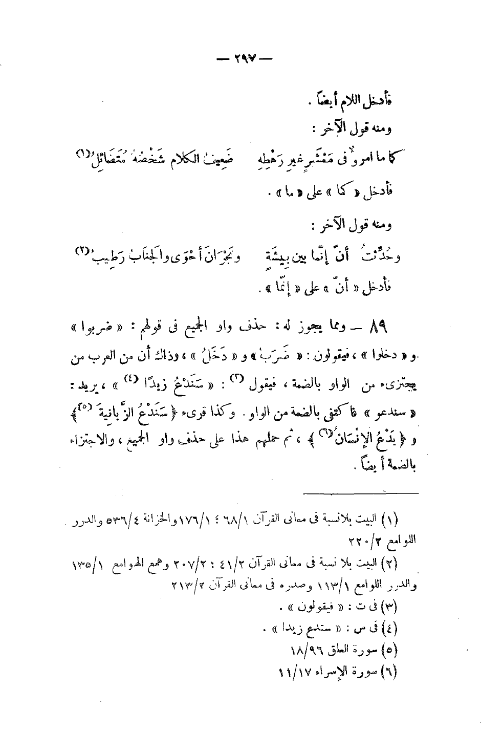 89 - ومما يجوز له: حذف واو الجميع في قولهم: ضربوا ودخلوا، فيقولون: ضَرَبُ ودَخَلُ، وذاك أن من العرب من يجتزئ من الواو بالضمة، فيقول: سَنَدْعُ زيداً، يريد: سندعو فاكتفى بالضمة من الواو.