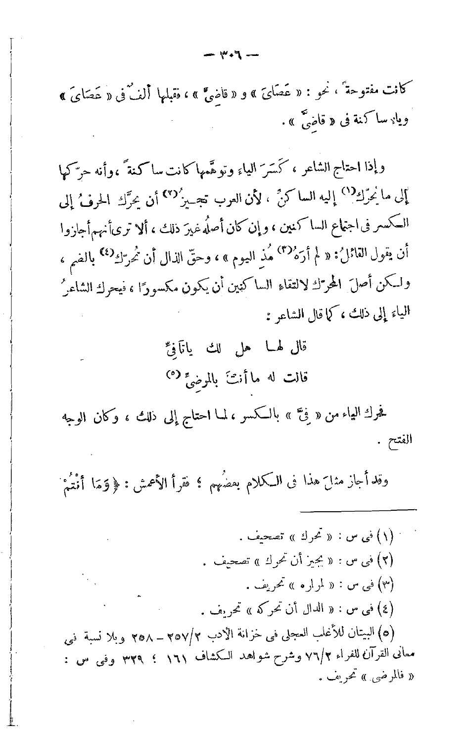 وإذا احتاج الشاعر، كَسَرَ الياء وتوهَّمها كانت ساكنةً، وأنه حرّكها إلى ما يُحرّك إليه الساكنُ، لأن العرب تجيزُ أن يحرَّك الحرفُ إلى الكسر في اجتماع الساكنين، وإن كان أصلهُ غيرَ ذلك، ألا ترى أنهم أجازوا أن يقول القائلُ: لم أرَهُ مُذِ اليومِ، وحقّ الذال أن تُحرّك بالضم، ولكن أصلَ المحرّك لالتقاء الساكنين أن يكون مكسوراً، فيحرك الشاعرُ الياءَ إلى ذلك، كما قال الشاعر:
