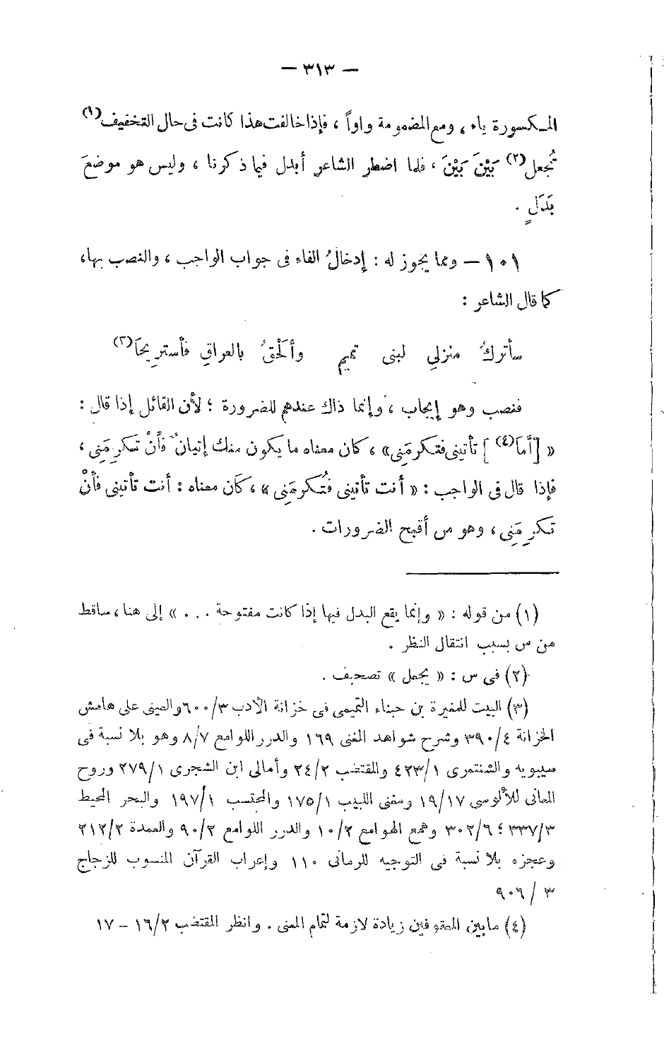 101 - ومما يجوز له: إدخالُ الفاء في جواب الواجب، والنصب بها، كما قال الشاعر: