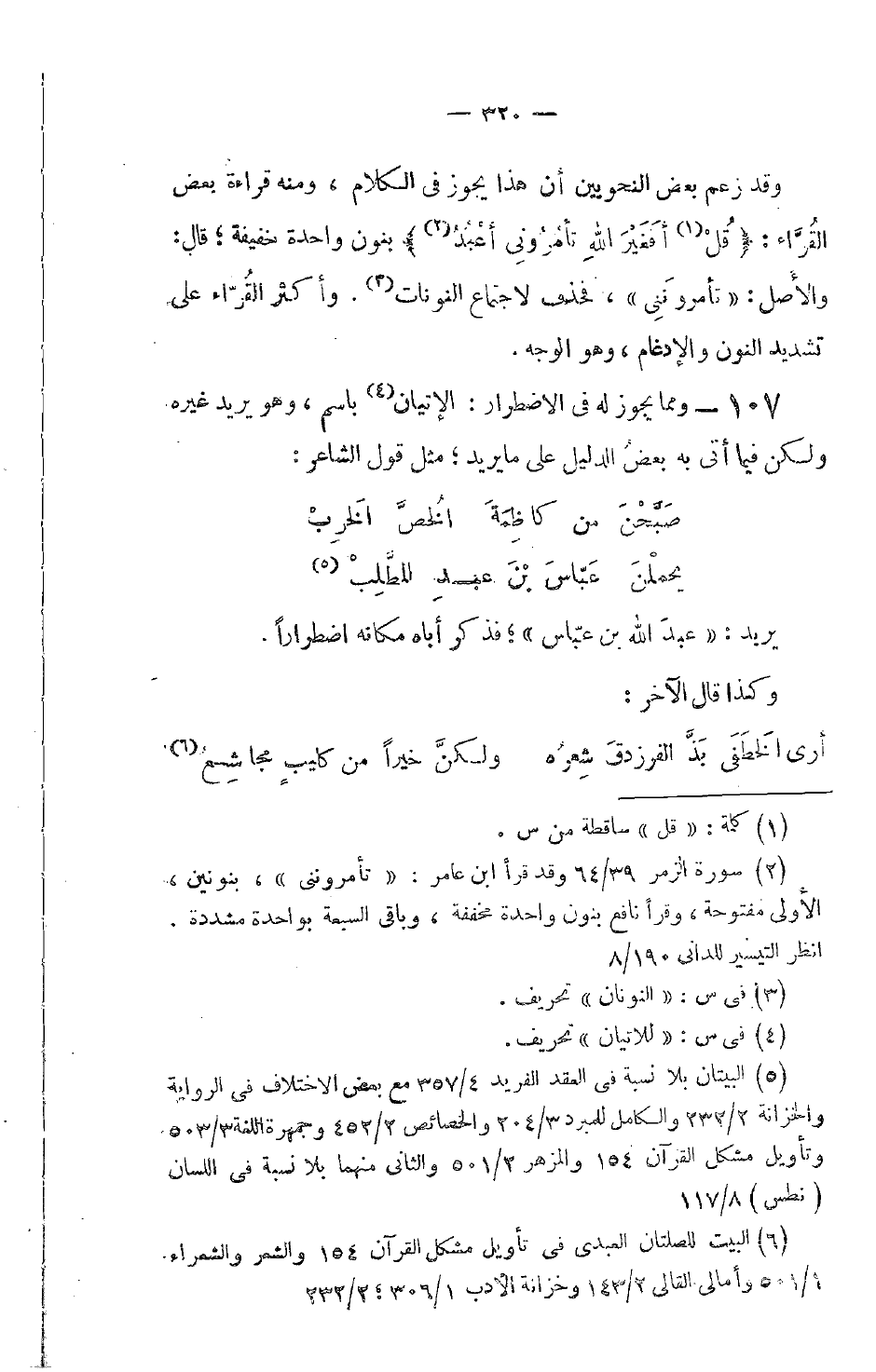 وقد زعم بعض النحويين أن هذا يجوز في الكلام، ومنه قراءة بعض القُرَّاء: {قُلْ أَفَغَيْرَ اللَّهِ تَأْمُرُونِّي أَعْبُدُ} بنون واحدة خفيفة؛ قال: والأصل: تأمرونَنِي، فحذف لاجتماع النونات. وأكثر القُرّاء على تشديد النون والإدغام، وهو الوجه.