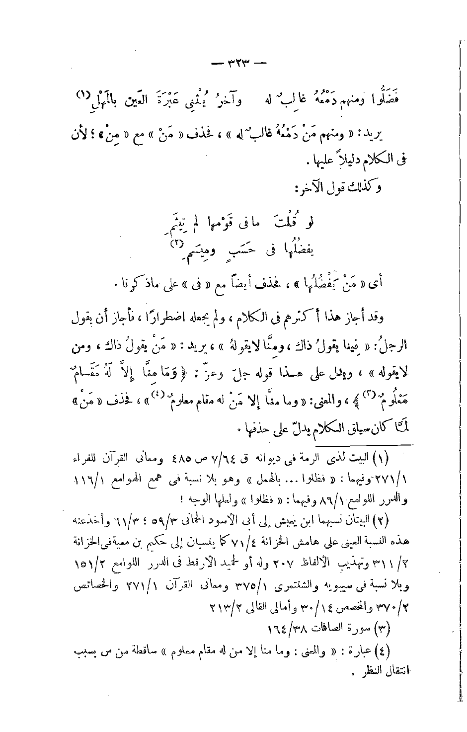 ذاك، ومِنَّا لا يقولُه، يريد: مَنْ يقولُ ذاك، ومن لا يقوله، ويدل على هذا قوله جلّ وعزّ: {وَمَا مِنَّا إِلَّا لَهُ مَقَامٌ مَّعْلُومٌ}، والمعنى: وما منَّا إلا مَنْ له مقام معلومٌ، فحذف مَنْ لَمَّا كان سياق الكلام يدلّ على حذفها.