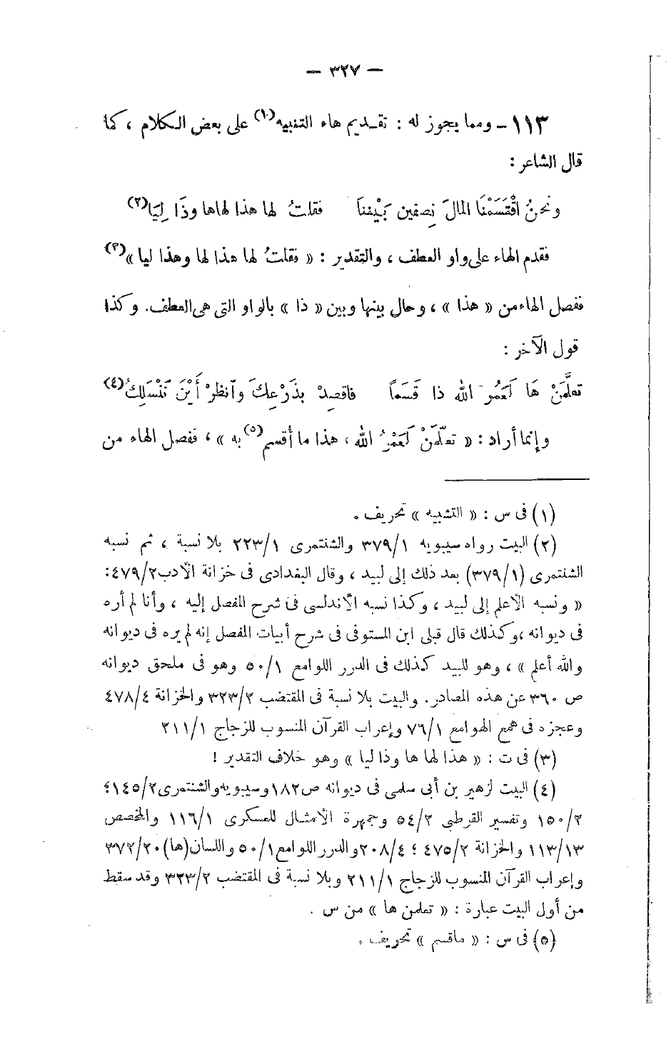 113 - ومما يجوز له: تقديم هاء التنبيه على بعض الكلام، كما قال الشاعر: