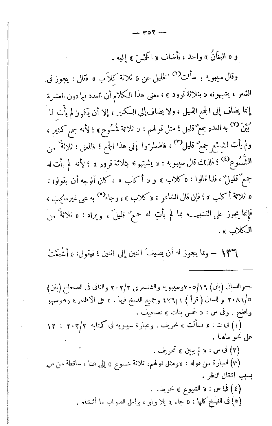 وقال سيبويه: سألت الخليل عن ثلاثة كِلاَب فقال: يجوز في الشعر، يشبهونه بثلاثة قرود، معنى هذا الكلام أن العدد فيما دون العشرة إنما يضاف إلى الجمع القليل، ولا يضاف إلى الكثير، إلا أن يكون لم يأت لما بُيِّنَ به العدد جمعٌ قليل؛ مثل قولهم: ثلاثة شُسُوع؛ لأنه جمع كثير، ولم يأت لشِسْعٍ جمعٌ قليل، فاضطّروا إلى هذا الجمع؛ فالمعنى: ثلاثةٌ من الشُّسُوع؛ فلذلك قال سيبويه: يشبّهونه بثلاثة قرود؛ لأنه لم يأت له جمعٌ قليلٌ، فلما قالوا: كلاب وأكلب، كان الوجه أن يقولوا: ثلاثة أكلب؛ فإن قال الشاعر: كلاب، وجاء به على غير ما يجب، فإنما يجوز على التشبيه بما لم يأتِ له جمعٌ قليلٌ، ويراد: ثلاثةٌ من الكلاب.