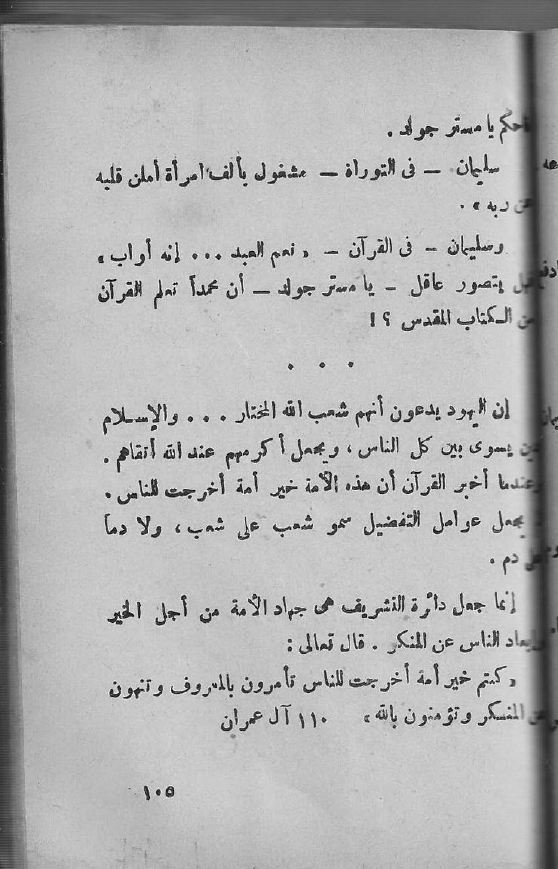 إن اليهود يدعون أنهم شعب الله المختار ..... والإسلام دين يسوي بين كل الناس، ويجعل أكرمهم عند الله أتقاهم. وعندما أخبر القرآن أن هذه الأمة خير أمة أخرجت للناس. يجعل عوامل التفضيل سمو شعب على شعب، ولا دما على دم.