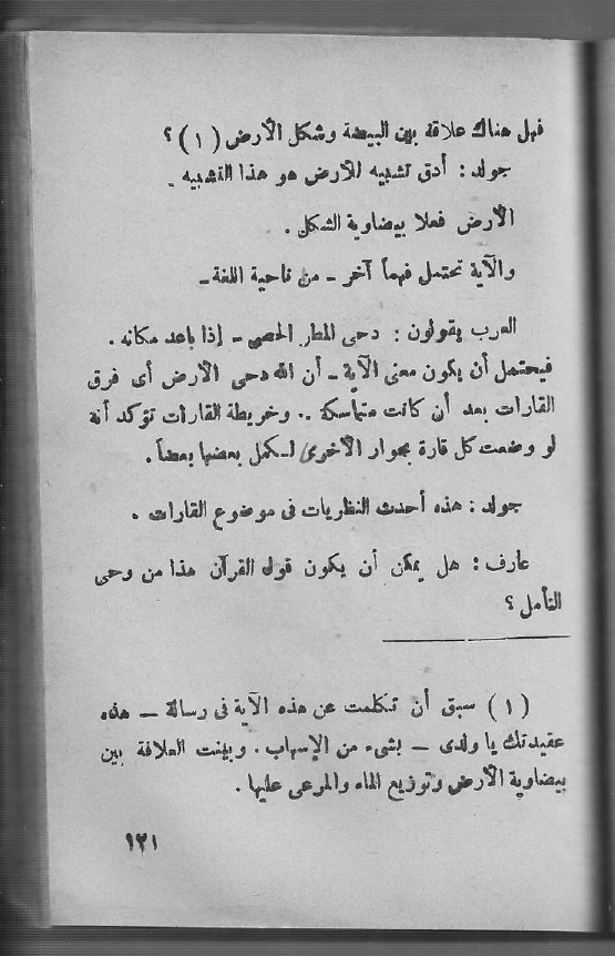 (1) سبق أن تكلمت عن هذه الآية في رسالة - هذه عقيدتك يا ولدي - بشيء من الإسهاب. وبينت العلاقة بين بيضاوية الأرض وتوزيع الماء والمرعى عليها.