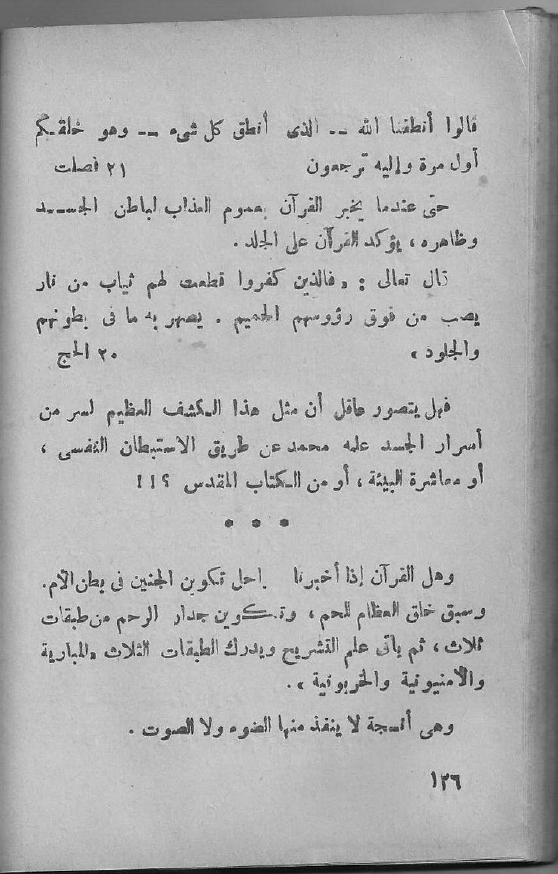 وهل القرآن إذا أخبرنا بمراحل تكوين الجنين في بطن الأم. وسبق خلق العظام للحم، وتكوين جدار الرحم من طبقات ثلاث، ثم يأتي علم التشريح ويدرك الطبقات الثلاث "المبارية والأمنيونية والخربونية".
