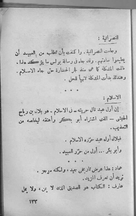 وجاءت النصرانية. واكتفت بأن تطلب من العبيد أن يطيعوا سادتهم. وقد جاء في رسالة بولس ما يؤكد هذا. ظلت المشكلة كما هي منذ فجر الحضارة حتى جاء الإسلام. وعندئذ بدأت المشكلة تتهيأ للحل.