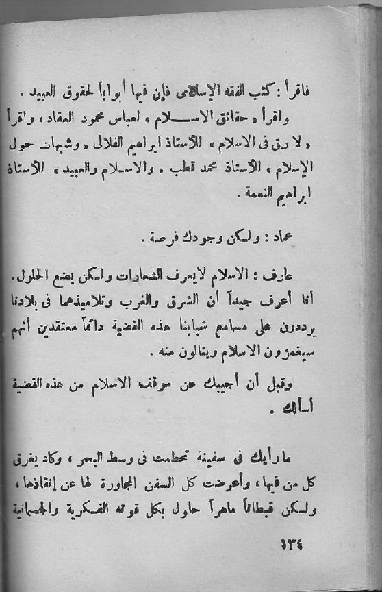 عارف: الإسلام لا يعرف الشعارات ولكن يضع الحلول. أنا أعرف جيداً أن الشرق والغرب وتلاميذهما في بلادنا يرددون على مسامع شبابنا هذه القضية دائما معتقدين أنهم سيغمزون الإسلام وتنالون منه.