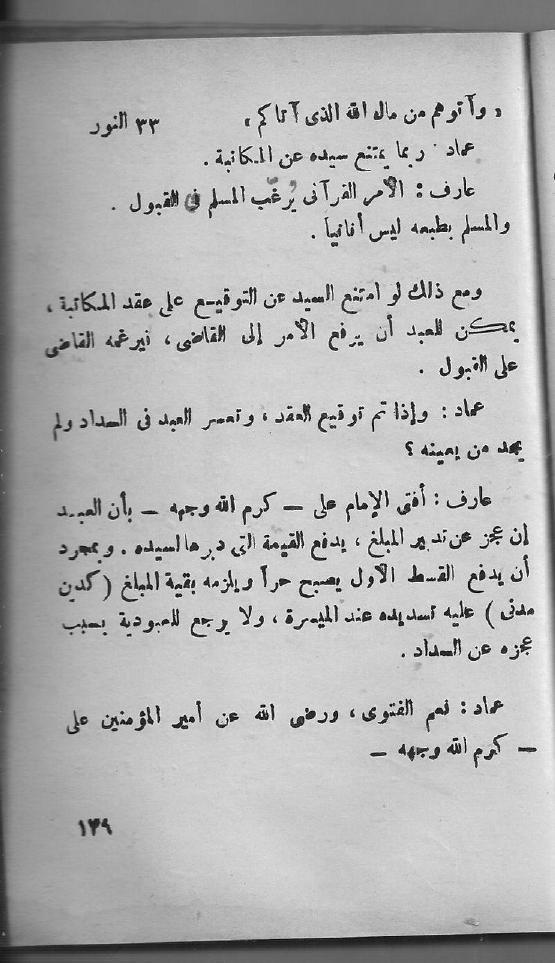 عارف: أفتى الإمام عليٌّ - كرم الله وجهه - بأن العبد إن عجز عن تدبير المبلغ، يدفع القيمة التي دبرها لسيده. وبمجرد أن يدفع القسط الأول يصبح حراً ويلزمه بقية المبلغ (كدين مدني) عليه تسديده عند الميسرة، ولا يرجع للعبودية بسبب عجزه عن السداد.