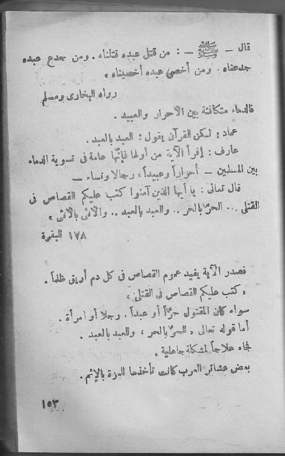 قال تعالى: {يَا أَيُّهَا الَّذِينَ آمَنُوا كُتِبَ عَلَيْكُمُ الْقِصَاصُ فِي الْقَتْلَى الْحُرُّ بِالْحُرِّ وَالْعَبْدُ بِالْعَبْدِ وَالْأُنْثَى بِالْأُنْثَى} 178 البقرة