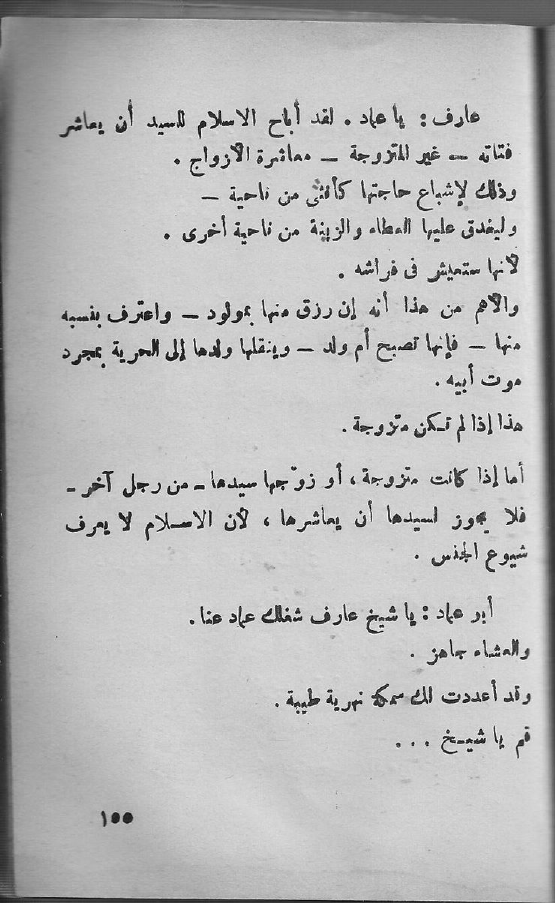 عارف: يا عماد. لقد أباح الإسلام للسيد أن يعاشر فتاته - غير المتزوجة - معاشرة الأزواج.