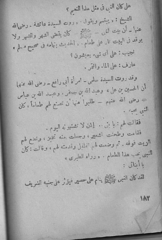 الشيخ: "يبتسم ويقول: "روت السيدة عائشة - رضي الله عنها - أن بيت النبي - صلى الله عليه وسلم - كان يقضي الشهر والشهر ولا يوقد في البيت نار على طعام. "الحديث بتمامه في صحيح مسلم"