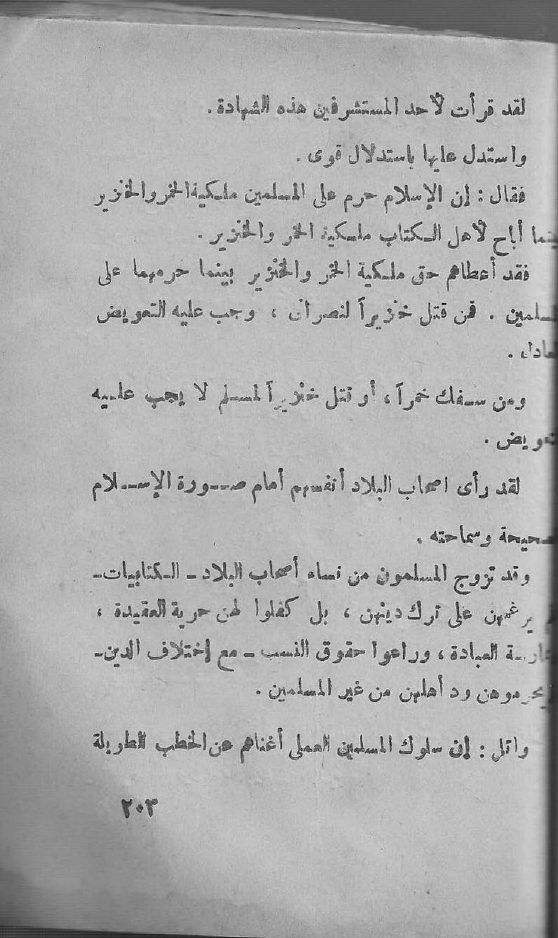 فقال: إن الإسلام حرم على المسلمين ملكية الخمر والخنزير بينما أباح لأهل الكتاب ملكية الخمر والخنزير.