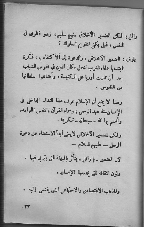 عارف: الضمير الأخلاقي، والدعوة إلى الاكتفاء به، فكرة ابتدعها علماء الغرب لتحل مكان الدين في نفوس الشباب بعد أن ثارت أوربا على الكنيسة، وأضاعوا سلطانها من النفوس.