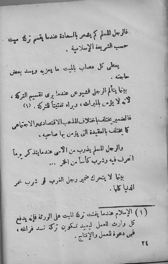 بينما يتألم الرجل الشيوعي عندما يرى تقسيم التركة، لأنه لا يؤمن الميراث، فيراه تفتيتاً للتركة. (1)