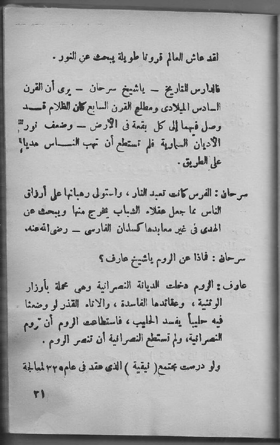 فالدارس للتاريخ - يا شيخ سرحان - يرى أن القرن السادس الميلادي ومطلع القرن السابع كان الظلام قد وصل فيهما إلى كل بقعة في الأرض - وضعف نور الأديان السماوية فلم تستطع أن تهب الناس هديا على الطريق.