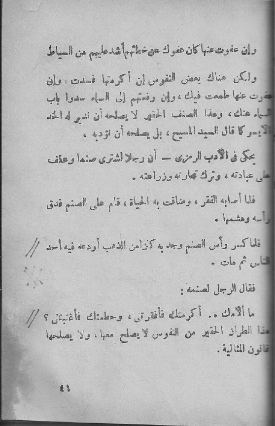 ولكن هناك بعض النفوس إن أكرمتها فسدت، وإن عفوت عنها طمعت فيك، وإن رفعتهم إلى السماء سدوا باب السماء عنك، وهذا الصنف الحقير لا يصلحه أن ندير له الخدَّ الأيسر كما قال السيد المسيح، بل يصلحه أن نؤدِّبه.