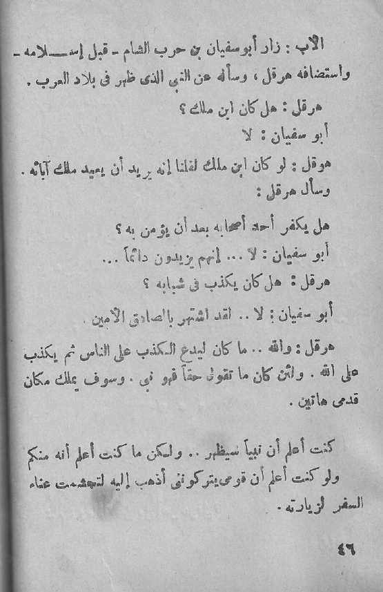 الأب: زار أبو سفيان بن حرب الشام - قبل إسلامه - واستضافه هرقل، وسأله عن النبي - صلى الله عليه وسلم - الذي ظهر في بلاد العرب.