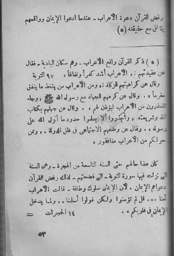 (*) ذكر القرآن واقع الإعراب - وهم سكان البادية - فقال عن عقيدتهم: {الْأَعْرَابُ أَشَدُّ كُفْرًا وَنِفَاقًا} 97 التوبة