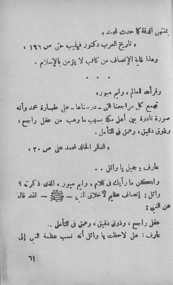 "تجمع كل مراجعنا التي - درسناها - على طهارة محمد وأنه صورة نادرة بين أهل مكة بسبب ما وهب من عقل راجح، وذوق دقيق، وعمق في التأمل".