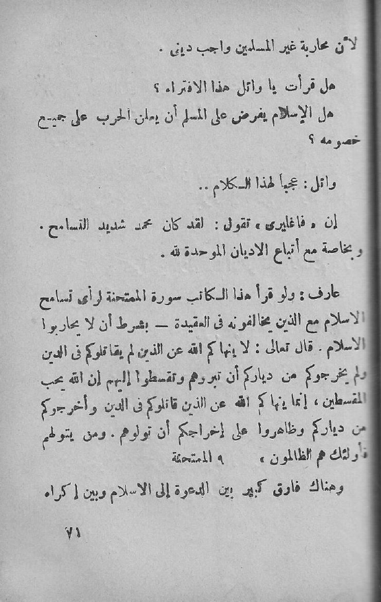 عارف: ولو قرأ هذا الكاتب سورة الممتحنة لرأى تسامح الإسلام مع الذين يخالفونه في العقيدة - بشرط أن لا يحاربوا الإسلام. قال تعالى: {لَا يَنْهَاكُمُ اللَّهُ عَنِ الَّذِينَ لَمْ يُقَاتِلُوكُمْ فِي الدِّينِ وَلَمْ يُخْرِجُوكُمْ مِنْ دِيَارِكُمْ أَنْ تَبَرُّوهُمْ وَتُقْسِطُوا إِلَيْهِمْ إِنَّ اللَّهَ يُحِبُّ الْمُقْسِطِينَ (8) إِنَّمَا يَنْهَاكُمُ اللَّهُ عَنِ الَّذِينَ قَاتَلُوكُمْ فِي الدِّينِ وَأَخْرَجُوكُمْ مِنْ دِيَارِكُمْ وَظَاهَرُوا عَلَى إِخْرَاجِكُمْ أَنْ تَوَلَّوْهُمْ وَمَنْ يَتَوَلَّهُمْ فَأُولَئِكَ هُمُ الظَّالِمُونَ} 9 الممتحنة