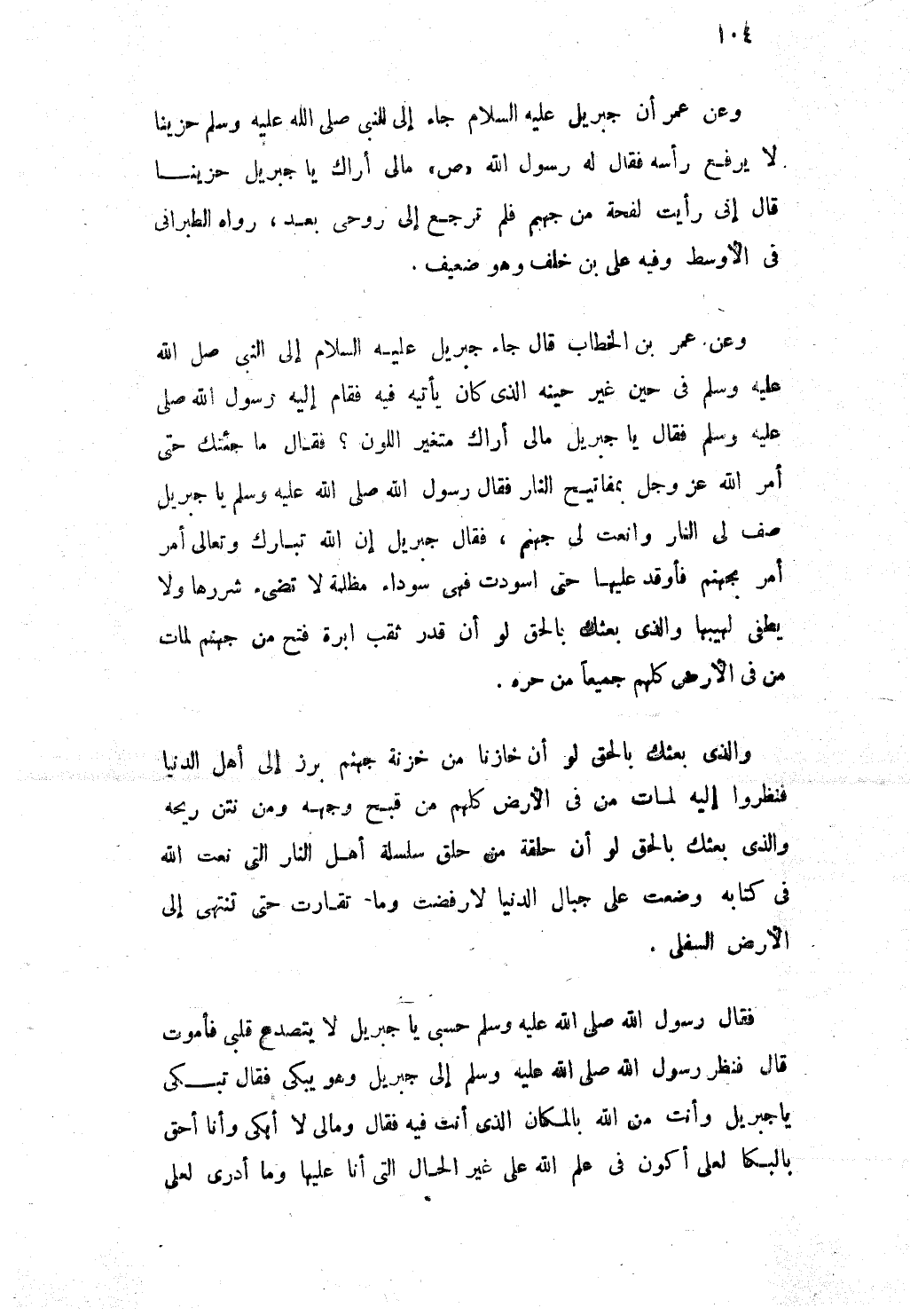 وَعَن عمر أَن جِبْرِيل عَلَيْهِ السَّلَام جَاءَ إِلَى النبى صلى الله عَلَيْهِ وَسلم حَزينًا لَا يرفع رَأسه فَقَالَ لَهُ رَسُول الله صلى الله عَلَيْهِ وَسلم مالى أَرَاك يَا جِبْرِيل حَزينًا قَالَ إنى رَأَيْت لفحة من جَهَنَّم فَلم ترجع إِلَى روحى بعد رَوَاهُ الطبرانى فى الْأَوْسَط وَفِيه على بن خلف وَهُوَ ضَعِيف