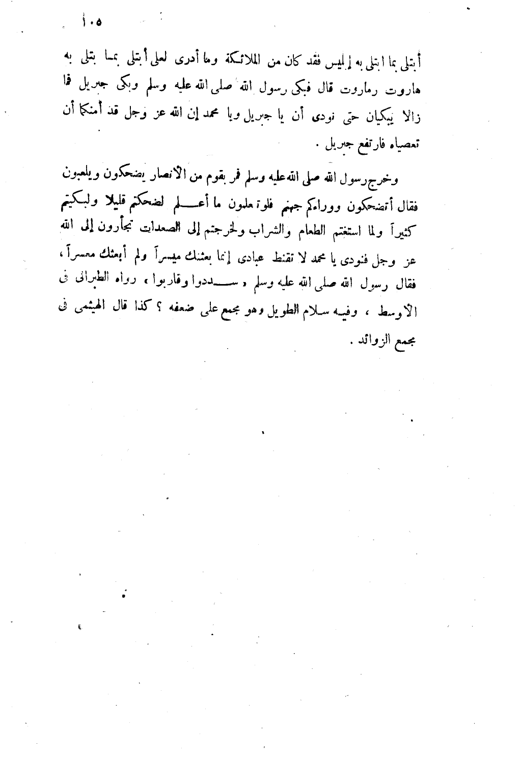 وَخرج رَسُول الله صلى الله عَلَيْهِ وَسلم فَمر بِقوم من الْأَنْصَار يَضْحَكُونَ ويلعبون فَقَالَ اتضحكون ووراءكم جَهَنَّم فَلَو تعلمُونَ مَا أعلم لضحكتم قَلِيلا ولبكيتم كثيرا وَلما استغتم الطَّعَام وَالشرَاب ولخرجتم إِلَى الصعدات تجأرون إِلَى الله عز وَجل فنودى يَا مُحَمَّد لَا تقنط عبادى إِنَّمَا بَعَثْتُك ميسرًا وَلم أَبْعَثك مُعسرا فَقَالَ رَسُول الله صلى الله عَلَيْهِ وَسلم سددوا وقاربوا رَوَاهُ الطبرانى فى الاوسط وَفِيه سَلام الطَّوِيل وَهُوَ مجمع على ضعفه كَذَا قَالَ الهيثمى أَن مجمع الزَّوَائِد