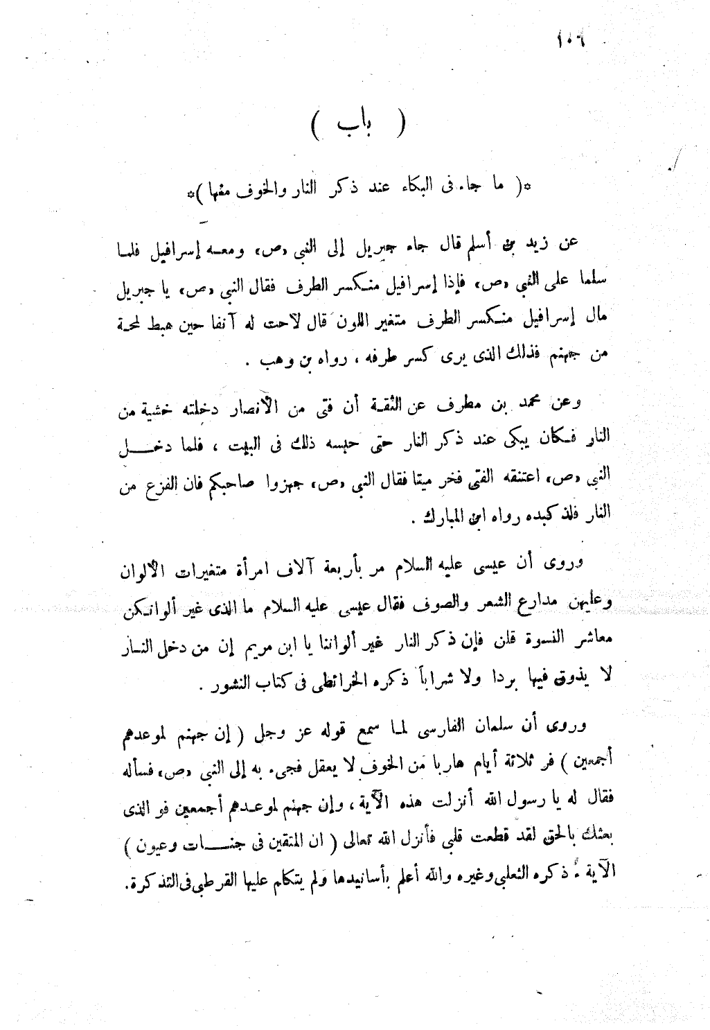 عَن زيد بن أسلم قَالَ جَاءَ جِبْرِيل إِلَى النبى صلى الله عَلَيْهِ وَسلم وَمَعَهُ إسْرَافيل فَلَمَّا سلما على النبى صلى الله عَلَيْهِ وَسلم فَإِذا إسْرَافيل منكسر الطّرف فَقَالَ النبى صلى الله عَلَيْهِ وَسلم يَا جِبْرِيل مَال إسْرَافيل منكسر الطّرف متغير اللَّوْن قَالَ لاحت لَهُ آنِفا حِين هَبَط لمحة من جَهَنَّم فَذَلِك الذى يرى كسر طرفه رَوَاهُ بن وهب