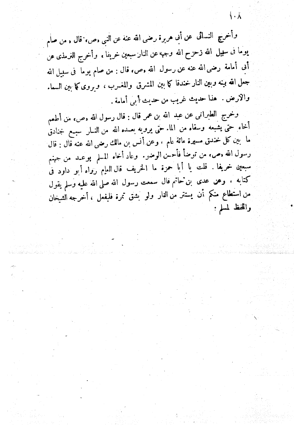 وَأخرج النسائى عَن أَبى هُرَيْرَة رضى الله عَنهُ عَن النبى صلى الله عَلَيْهِ وَسلم قَالَ من صَامَ يَوْمًا فى سَبِيل الله زحزح الله وَجهه عَن النَّار سبعين خَرِيفًا وَأخرج الترمذى عَن أَبى أُمَامَة رضى الله عَنهُ عَن رَسُول الله صلى الله عَلَيْهِ وَسلم قَالَ من صَامَ يَوْمًا فى سَبِيل الله جعل الله بَينه وَبَين النَّار خَنْدَقًا كَمَا بَين الْمشرق وَالْمغْرب ويروى كَمَا بَين السَّمَاء وَالْأَرْض هَذَا حَدِيث غَرِيب من حَدِيث أَبى أُمَامَة