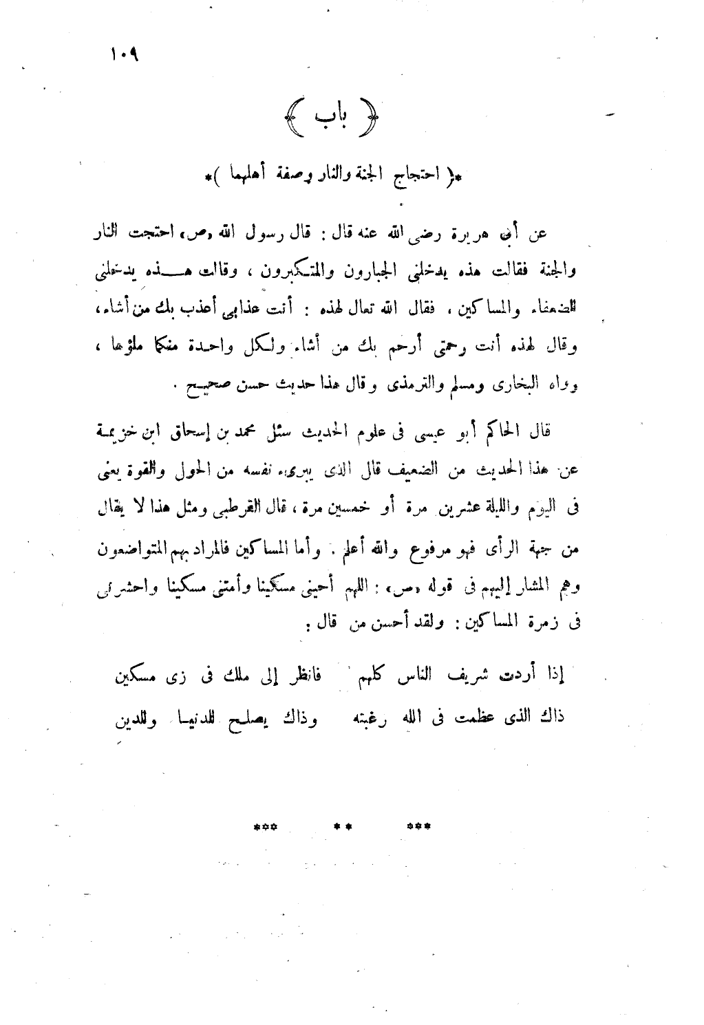 عَن أَبى هُرَيْرَة رضى الله عَنهُ قَالَ قَالَ رَسُول الله صلى الله عَلَيْهِ وَسلم احتجت النَّار وَالْجنَّة فَقَالَت هَذِه يدخلنى الجبارون والمتكبرون وَقَالَت هَذِه يدخلنى الضُّعَفَاء وَالْمَسَاكِين فَقَالَ الله تَعَالَى لهَذِهِ أَنْت عذابى أعذب بك من أَشَاء وَقَالَ لهَذِهِ أَنْت رحمتى أرْحم بك من أَشَاء وَلكُل وَاحِدَة مِنْكُمَا ملؤُهَا رَوَاهُ البخارى وَمُسلم والترمذى وَقَالَ هَذَا حَدِيث حسن صَحِيح