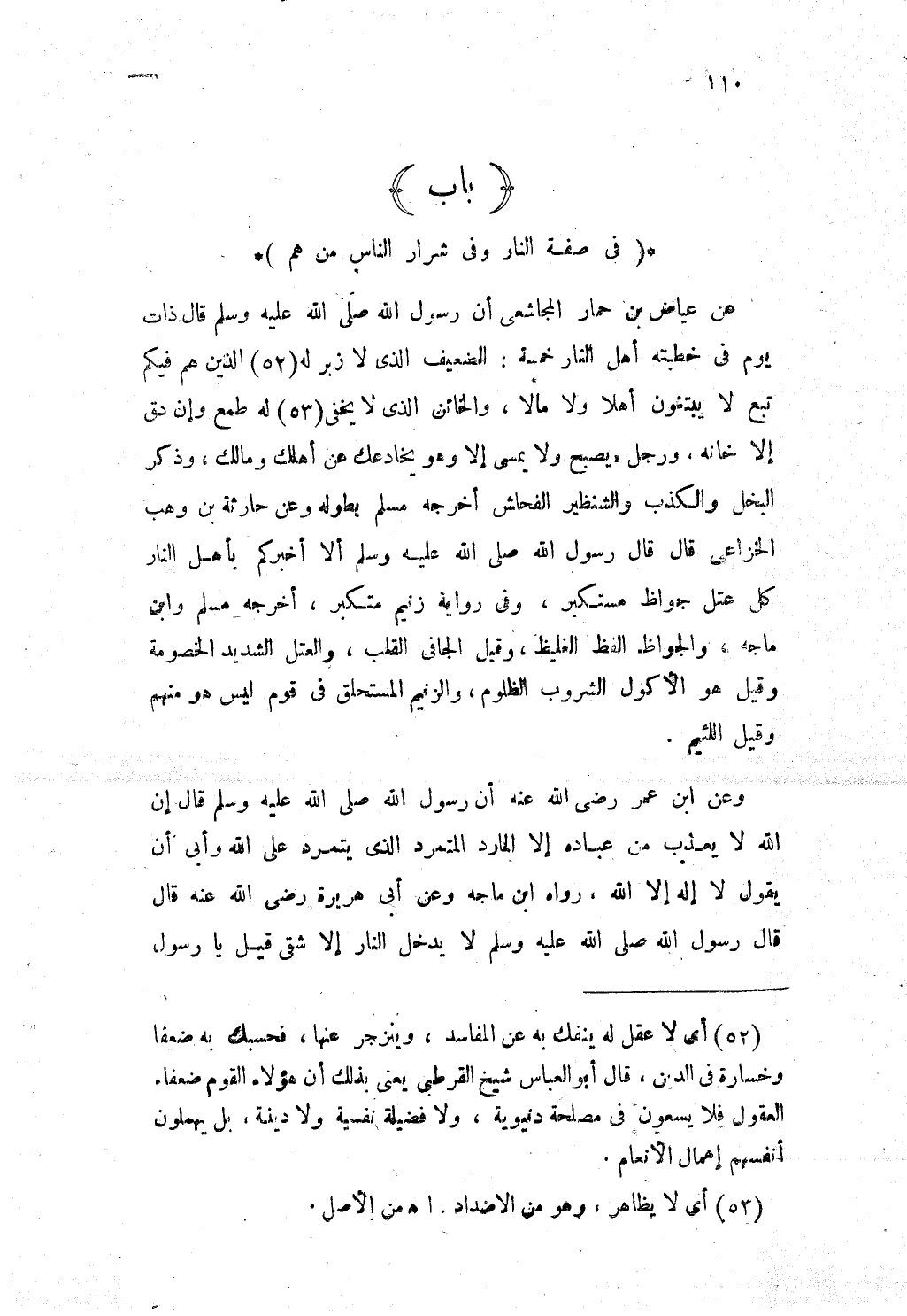 عَن عِيَاض بن حمَار المجاشعى أَن رَسُول الله صلى الله عَلَيْهِ وَسلم قَالَ ذَات يَوْم فى خطبَته أهل النَّار خَمْسَة الضَّعِيف الذى لَا زبر لَهُ الَّذين هم فِيكُم تبع لَا يَبْتَغُونَ أَهلا وَلَا مَالا والخائن الذى لايخفى لَهُ طمع وَإِن دق إِلَّا خانه وَرجل يصبح وَلَا يمسى إِلَّا وَهُوَ يخادعك عَن أهلك وَمَالك وَذكر الْبُخْل وَالْكذب والشنظير الفحاش أخرجه مُسلم بِطُولِهِ وَعَن حَارِثَة بن وهب الخزاعى قَالَ قَالَ رَسُول الله صلى الله عَلَيْهِ وَسلم أَلا أخْبركُم بِأَهْل النَّار كل عتل جواظ مستكبر وفى رِوَايَة زنيم متكبر أخرجه مُسلم وَابْن ماجة والجواظ اللَّفْظ الغليظ وَقيل الجافى الْقلب والعتل الشَّديد الْخُصُومَة وَقيل هُوَ الأكول الشروب الظلوم والزنيم المستحلق فى قوم لَيْسَ هُوَ مِنْهُم وَقيل اللَّئِيم