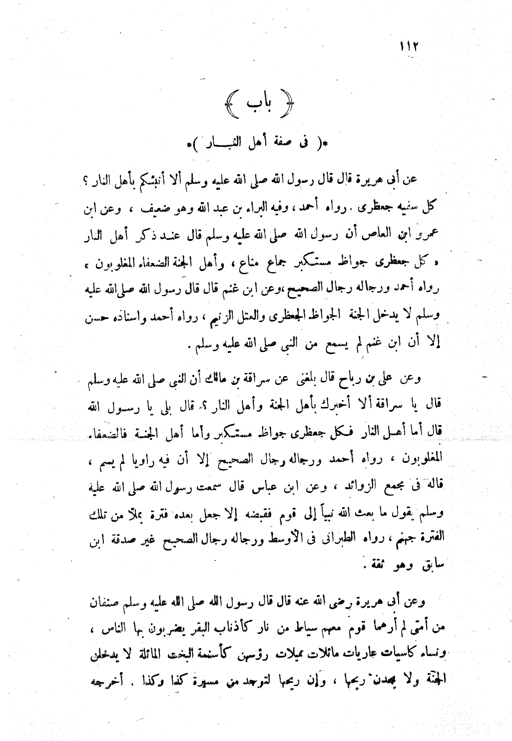 عَن أَبى هُرَيْرَة قَالَ قَالَ رَسُول الله صلى الله عَلَيْهِ وَسلم أَلا أنبئكم بِأَهْل النَّار كل سَفِيه جعظرى رَوَاهُ أَحْمد وَفِيه الْبَراء بن عبد الله وَهُوَ ضَعِيف وَعَن ابْن عَمْرو ابْن الْعَاصِ أَن رَسُول الله صلى الله عَلَيْهِ وَسلم قَالَ عِنْد ذكر أهل النَّار كل جعظرى جواظ مستكبر جماع مناع وَأهل الْجنَّة الضُّعَفَاء المغلوبون رَوَاهُ أَحْمد وَرِجَاله رجال الصَّحِيح وَعَن ابْن غنم قَالَ قَالَ رَسُول الله صلى الله عَلَيْهِ وَسلم لَا يدْخل الْجنَّة الجواظ الجعظرى والعتل الزنيم رَوَاهُ أَحْمد واسناده حسن إِلَّا أَن ابْن غنم لم يسمع من النبى صلى الله عَلَيْهِ وَسلم