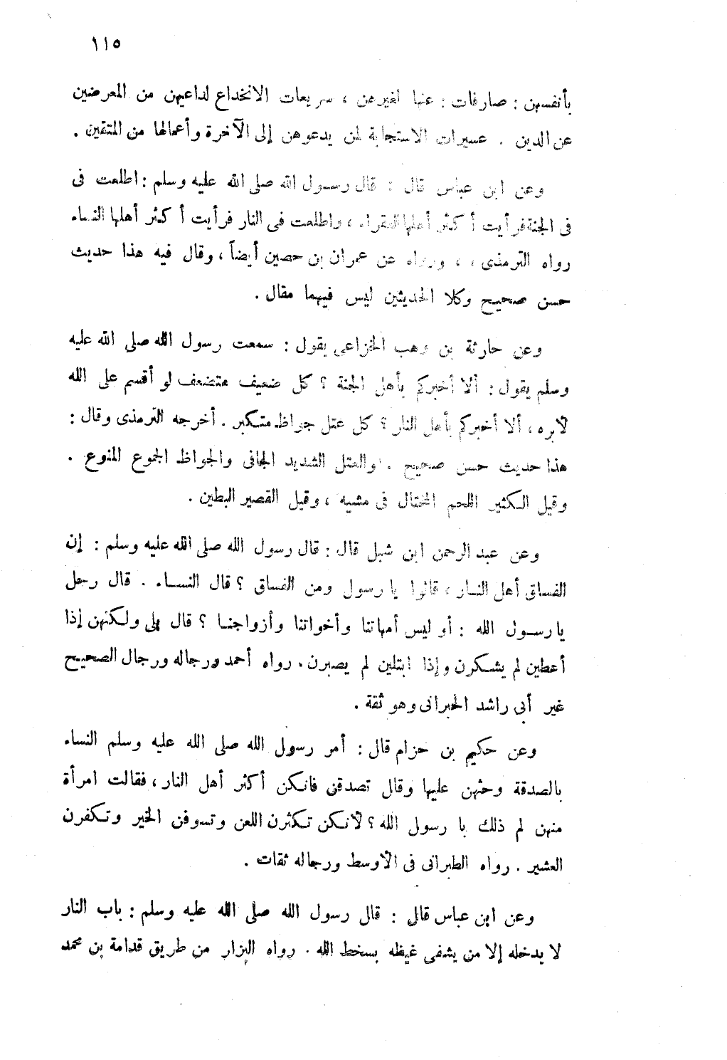 وَعَن حَكِيم بن حزَام قَالَ أَمر رَسُول الله صلى الله عَلَيْهِ وَسلم النِّسَاء بِالصَّدَقَةِ وحثهن عَلَيْهَا وَقَالَ تصدقن فانكن أَكثر أهل النَّار فَقَالَت امْرَأَة مِنْهُنَّ لم ذَلِك يَا رَسُول اللهلانكن تكثرن اللَّعْن وتسوفن الْخَيْر وتكفرن العشير رَوَاهُ الطبرانى فى الْأَوْسَط وَرِجَاله ثِقَات