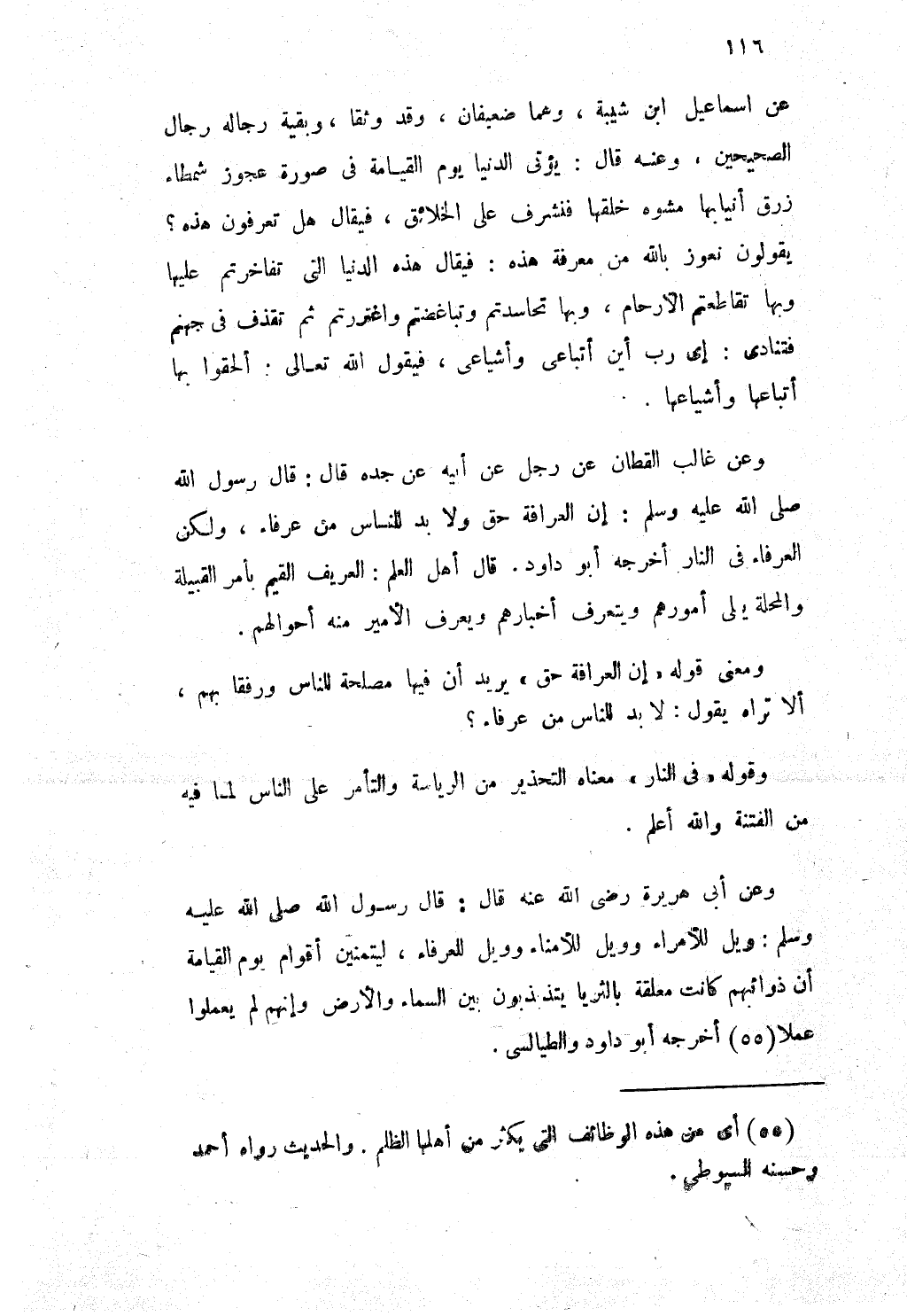 وَعَن غَالب الْقطَّان عَن رجل عَن أَبِيه عَن جده قَالَ قَالَ رَسُول الله صلى الله عَلَيْهِ وَسلم إِن العرافة حق وَلَا بُد للنَّاس من عرفاء وَلَكِن العرفاء فى النَّار أخرجه أَبُو دَاوُد قَالَ أهل الْعلم العريف الْقيم بِأَمْر الْقَبِيلَة والمحلة يلى أُمُورهم ويتعرف أخبارهم وَيعرف الْأَمِير مِنْهُ أَحْوَالهم