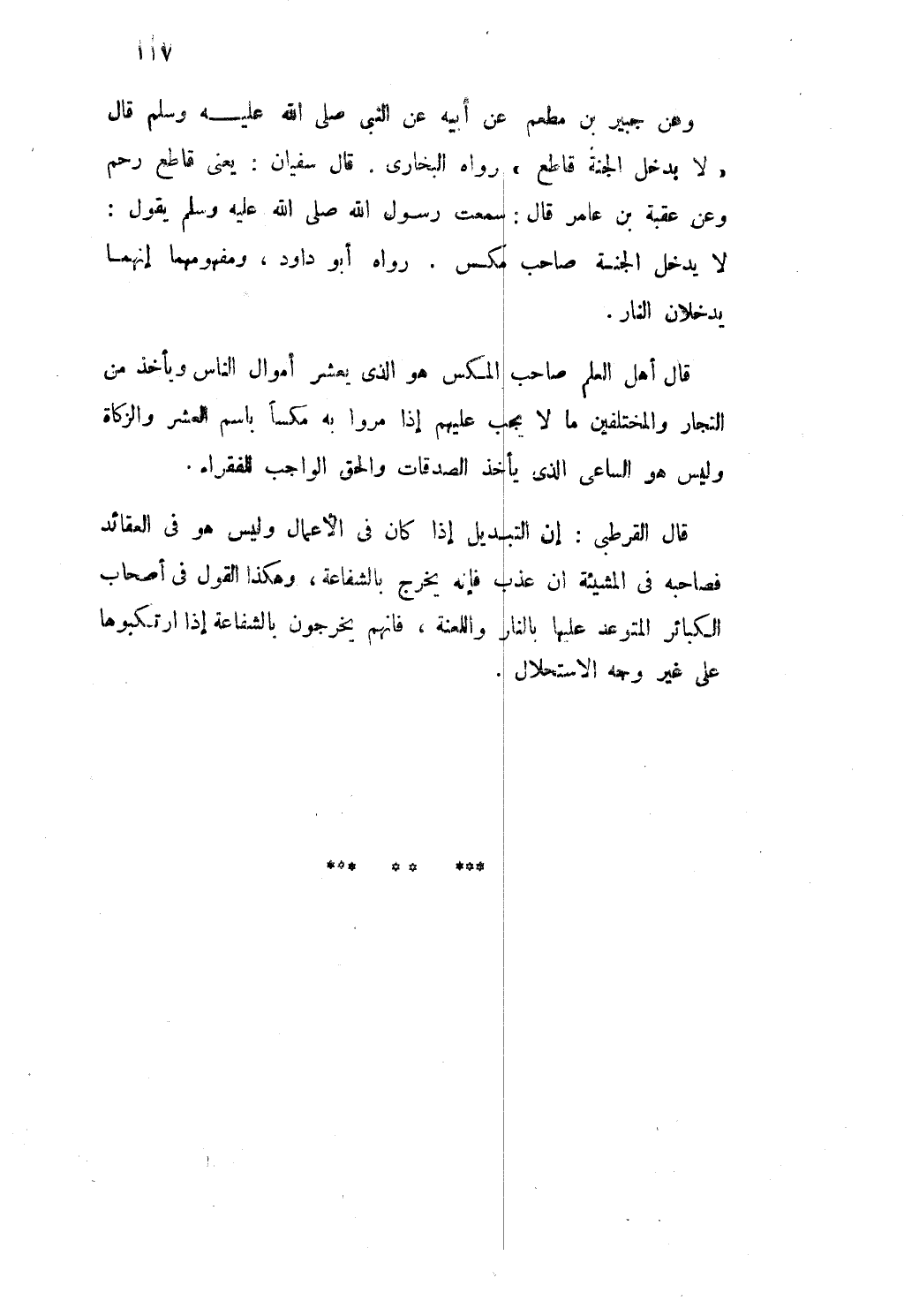وَعَن جُبَير بن مطعم عَن أَبِيه عَن النبى صلى الله عَلَيْهِ وَسلم قَالَ لَا يدْخل الْجنَّة قَاطع رَوَاهُ البخارى قَالَ سُفْيَان يعْنى يعْنى قَاطع رحم وَعَن عقبَة بن عَامر قَالَ سَمِعت رَسُول الله صلى الله عَلَيْهِ وَسلم يَقُول لَا يدْخل الْجنَّة صَاحب مكس رَوَاهُ أَبُو دَاوُد ومفهومها إنَّهُمَا يدخلَانِ النَّار