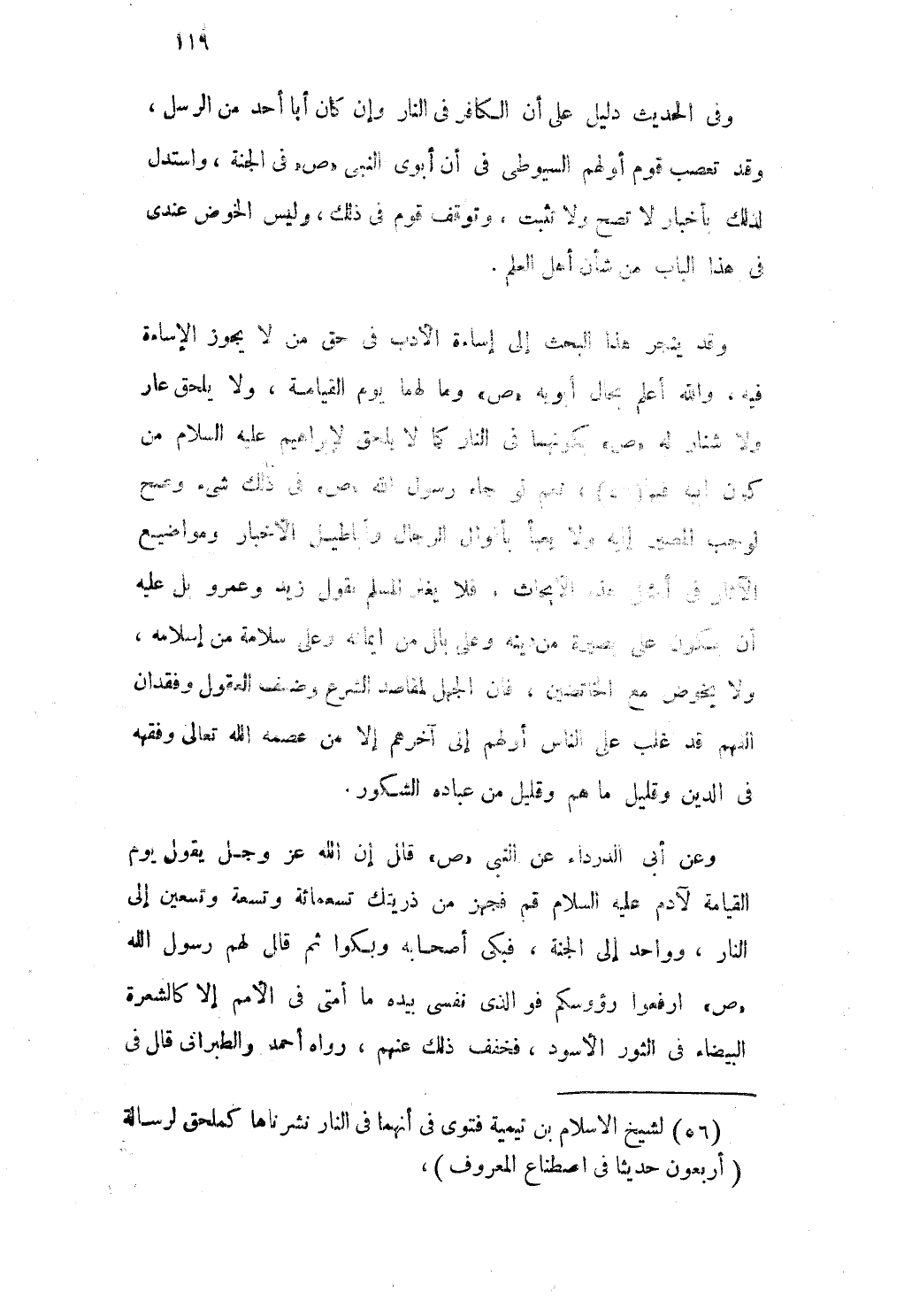 وَقد ينجر هَذَا الْبَحْث إِلَى إساءة الْأَدَب فى حق من لَا يجوز الْإِسَاءَة فِيهِ وَالله أعلم بِحَال أَبَوَيْهِ صلى الله عَلَيْهِ وَسلم وَمَا لَهما يَوْم الْقِيَامَة وَلَا يلْحق عَار وَلَا شنار لَهُ صلى الله عَلَيْهِ وَسلم بكونهما فى النَّار كَمَا لَا يلْحق لإِبْرَاهِيم عَلَيْهِ السَّلَام من كَون أَبِيه فِيهَا نعم لَو جَاءَ رَسُول الله صلى الله عَلَيْهِ وَسلم فى ذَلِك شىء وَصَحَّ لوَجَبَ الْمصير إِلَيْهِ وَلَا يعبأ بأقوال الرِّجَال وأباطيل الْأَخْبَار ومواضيع الْآثَار فى أَمْثَال هَذِه الأبحاث فَلَا يغتر الْمُسلم بقول زيد وَعَمْرو بل عَلَيْهِ أَن يكون على بَصِيرَة من دينه وعَلى بَلل من إيمَانه وعَلى سَلامَة من إِسْلَامه وَلَا يَخُوض مَعَ الخائضين فان الْجَهْل لمقاصد الشَّرْع وَضعف الْعُقُول وفقدان الْفَهم قد غلب على النَّاس أَوَّلهمْ إِلَى آخِرهم إِلَّا من عصمه الله تَعَالَى وفقهه فى الدّين وَقَلِيل مَا هم وَقَلِيل من عباده الشكُور