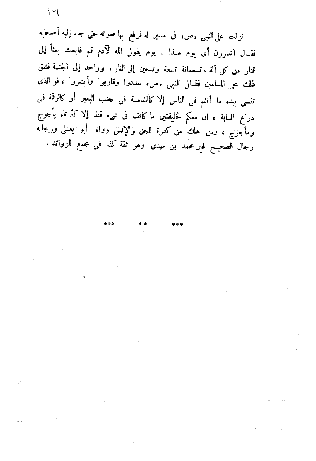 نزلت على النبى صلى الله عَلَيْهِ وَسلم فى مسير لَهُ فَرفع بهَا صَوته حَتَّى جَاءَ إِلَيْهِ أَصْحَابه فَقَالَ أَتَدْرُونَ أى يَوْم هَذَا يَوْم يَقُول الله لآدَم قُم فَابْعَثْ بعثا إِلَى النَّار من كل ألف تِسْعمائَة تِسْعَة وَتِسْعين إِلَى النَّار وَوَاحِد إِلَى الْجنَّة فشق ذَلِك على الْمُسلمين فَقَالَ النبى صلى الله عَلَيْهِ وَسلم سددوا وقاربوا وابشروا فوالذى نفسى بِيَدِهِ مَا أَنْتُم فى النَّاس إِلَّا كَالشَّامَةِ فى جنب الْبَعِير أَو كالرقمة فى ذِرَاع الدَّابَّة ان مَعكُمْ لخليقتين مَا كَانَتَا فى شىء قطّ إِلَّا كَثرَتَاهُ يَأْجُوج وَمَأْجُوج وَمن هلك من كفرة الْجِنّ والانس رَوَاهُ أَبُو يعلى وَرِجَاله رجال الصَّحِيح غير مُحَمَّد بن مهدى وَهُوَ ثِقَة كَذَا فى مجمع الزَّوَائِد