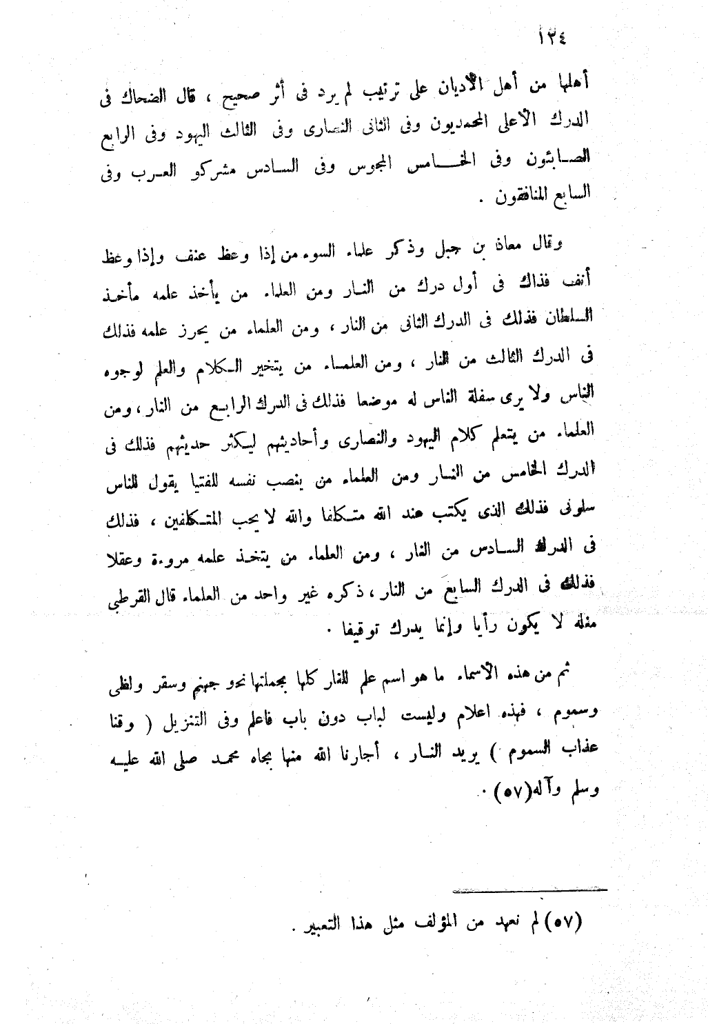 أَهلهَا من أهل الْأَدْيَان على تَرْتِيب لم يرد فى أثر صَحِيح قَالَ الضَّحَّاك فى الدَّرك الْأَعْلَى المحمديون وفى الثانى النَّصَارَى وفى الثَّالِث الْيَهُود وفى الرَّابِع الصابئون وفى الْخَامِس الْمَجُوس وفى السَّادِس مشركو الْعَرَب وفى السَّابِع المُنَافِقُونَ