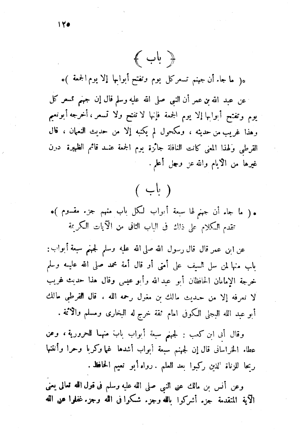 عَن ابْن عمر قَالَ قَالَ رَسُول الله صلى الله عَلَيْهِ وَسلم لِجَهَنَّم سَبْعَة أَبْوَاب بَاب مِنْهَا لمن سل السَّيْف على أمتى أَو قَالَ أمة مُحَمَّد صلى الله عَلَيْهِ وَسلم خرجَة الإمامان الحافظان أَبُو عبد الله وَأَبُو عِيسَى وَقَالَ هَذَا حَدِيث غَرِيب لَا نعرفه إلامن حَدِيث مَالك بن مغول رَحمَه الله قَالَ القرطبى مَالك أَبُو عبد الله البجلى الكوفى امام ثِقَة خرج لَهُ البخارى وَمُسلم والائمة