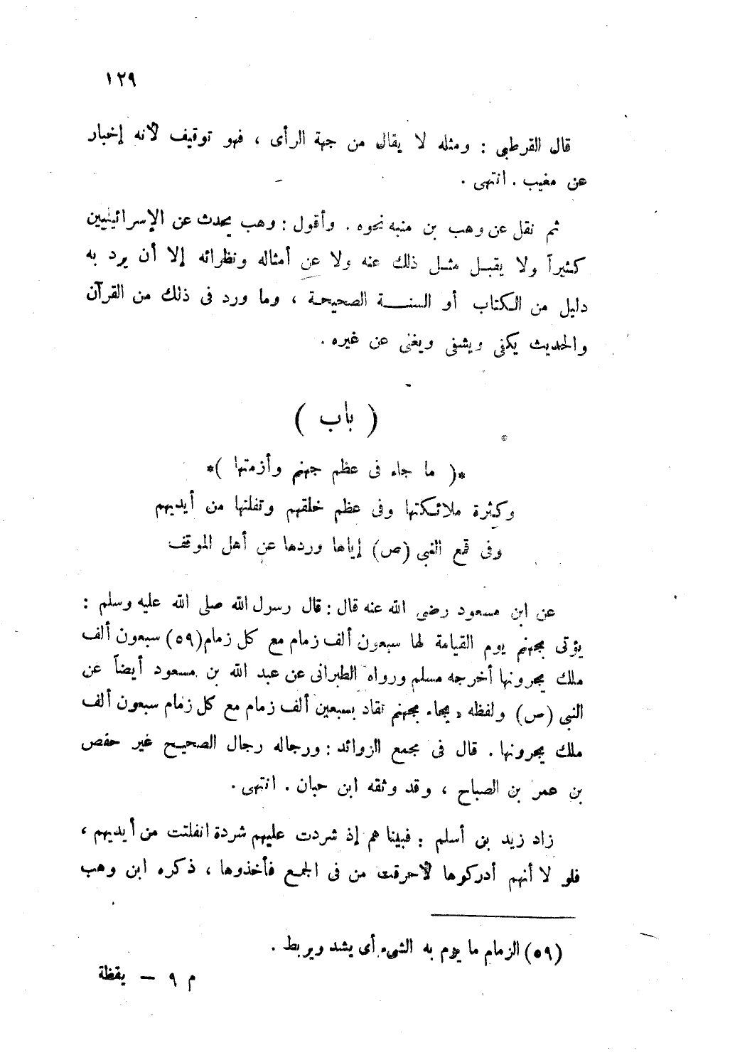 عَن ابْن مَسْعُود رضى الله عَنهُ قَالَ قَالَ رَسُول الله صلى الله عَلَيْهِ وَسلم يُؤْتى بجهنم يَوْم الْقِيَامَة لَهَا سَبْعُونَ ألف زِمَام مَعَ كل زِمَام سَبْعُونَ الف ملك يجرونها أخرجه مُسلم وَرَوَاهُ الطبرانى عَن عبد الله بن مَسْعُود أَيْضا عَن النبى صلى الله عَلَيْهِ وَسلم وَلَفظه يجاء بجهنم تقاد بسبعين ألف زِمَام مَعَ كل زِمَام سَبْعُونَ ألف ملك يجرونها قَالَ فى مجمع الزَّوَائِد وَرِجَاله رجال الصَّحِيح غير حَفْص بن عمر بن الصَّباح وَقد وَثَّقَهُ ابْن حبَان انْتهى