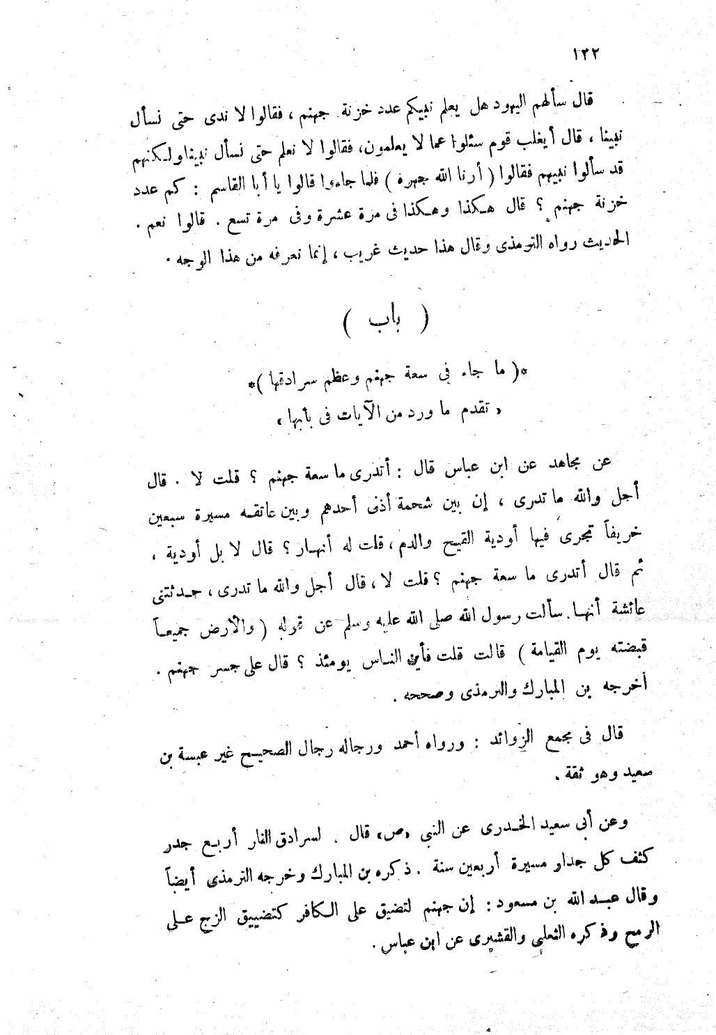 قَالَ سَأَلَهُمْ الْيَهُود هَل يعلم نَبِيكُم عدد خَزَنَة جَهَنَّم فَقَالُوا لَا ندى حَتَّى نسْأَل نَبينَا قَالَ أيغلب قوم سئلوا عَمَّا لَا يعلمُونَ فَقَالُوا لَا نعلم حَتَّى نسْأَل نَبينَا وَلَكنهُمْ قد سَأَلُوا نَبِيّهم فَقَالُوا أرنا الله جهره فَلَمَّا جَاءُوا قَالُوا يَا أَبَا الْقَاسِم كم عدد خَزَنَة جَهَنَّم قَالَ هَكَذَا هَكَذَا فى مرّة عشرَة وفى مرّة تسع قَالُوا نعم الحَدِيث رَوَاهُ الترمذى وَقَالَ هَذَا حَدِيث غَرِيب إِنَّمَا لَا نعرفه من هَذَا الْوَجْه