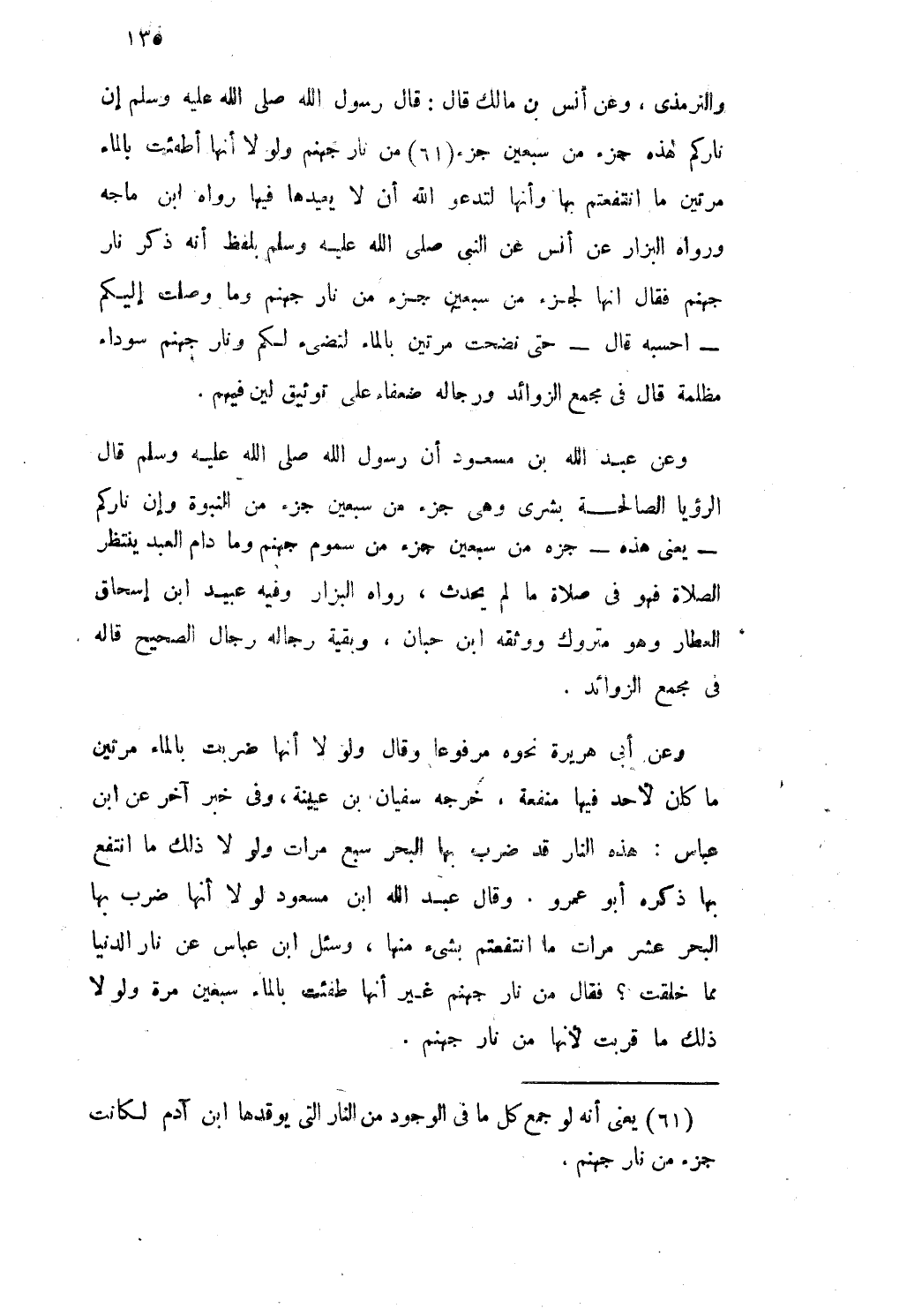 والترمذى وَعَن أنس بن مَالك قَالَ قَالَ رَسُول الله صلى الله عَلَيْهِ وَسلم إِن نَاركُمْ هَذِه جُزْء من سبعين جُزْء من نَار جَهَنَّم وَلَوْلَا أَنَّهَا أطفئت بِالْمَاءِ مرَّتَيْنِ مَا انتفعتم بهَا وَأَنَّهَا لتدعو الله أَن لَا يُعِيدهَا فِيهَا رَوَاهُ ابْن مَاجَه وَرَوَاهُ الْبَزَّار عَن أنس عَن النبى صلى الله عَلَيْهِ وَسلم بِلَفْظ أَنه ذكر نَار جَهَنَّم فَقَالَ انها لجزء من سبعين جُزْء من نَار جَهَنَّم وَمَا وصلت إِلَيْكُم أَحْسبهُ قَالَ حَتَّى نضحت مرَّتَيْنِ بِالْمَاءِ لتضىء لكم ونار جَهَنَّم سَوْدَاء مظْلمَة قَالَ فى مجمع الزَّوَائِد وَرِجَاله ضعفاء على تَوْثِيق لين فيهم