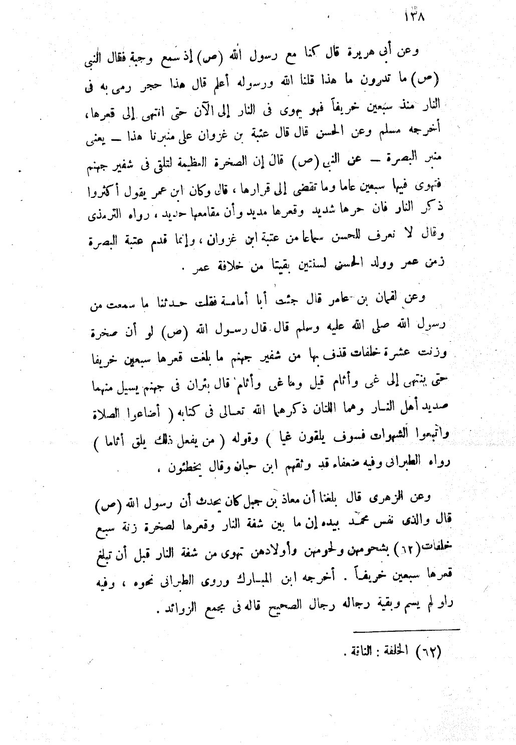 وَعَن الزهرى قَالَ بلغنَا أَن معَاذ بن جبل كَانَ يحدث أَن رَسُول الله صلى الله عَلَيْهِ وَسلم قَالَ والذى نفس مُحَمَّد بِيَدِهِ إِن مَا بَين شفة النَّار وقعرها لصخرة زنة سبع خلفات بشحومهن ولحومهن وأولادهن تهوى من شفة النَّار قبل أَن تبلغ قعرها سبعين خَرِيفًا أخرجه ابْن الْمُبَارك وروى الطبرانى نَحوه وَفِيه وَاو لم يسم وَبَقِيَّة رِجَاله رجال الصَّحِيح قَالَه فى مجمع الزَّوَائِد