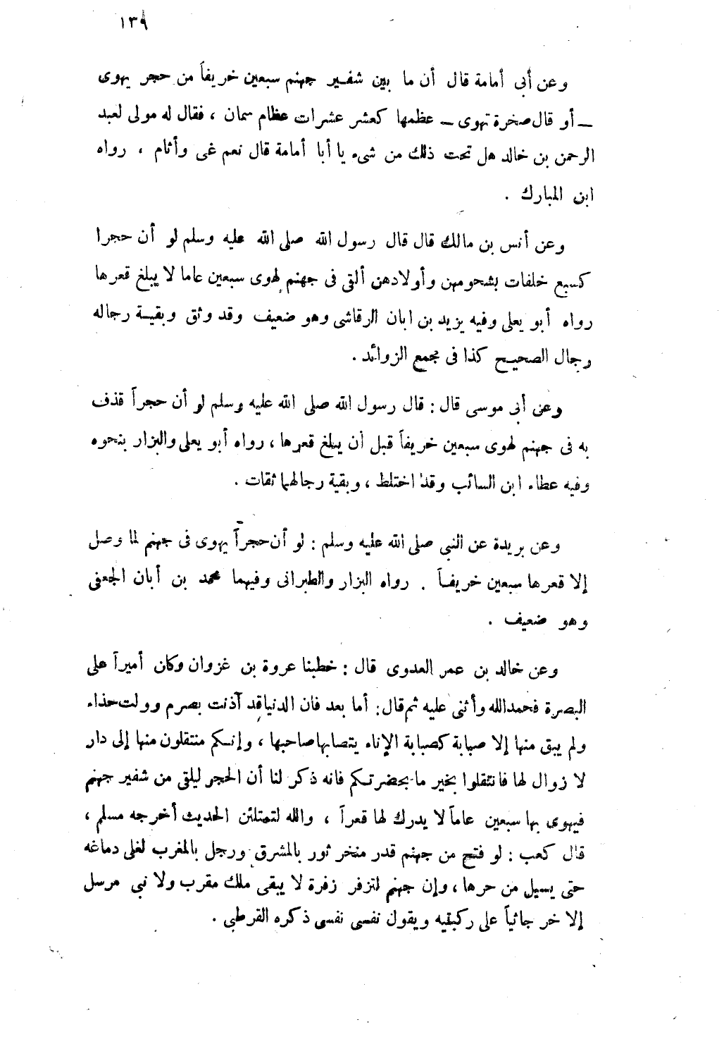 وَعَن خَالِد بن عمر الْعَدْوى قَالَ خَطَبنَا عُرْوَة بن غَزوَان وَكَانَ أَمِيرا على الْبَصْرَة فَحَمدَ الله وَأثْنى عَلَيْهِ ثمَّ قَالَ أما بعد فان الدُّنْيَا قد آذَنت بِصرْم وَوَلَّتْ حذاء وَلم يبْق مِنْهَا إِلَّا صبَابَة كَصُبَابَةِ الْإِنَاء يتصابها صَاحبهَا وَإِنَّكُمْ منتقلون مِنْهَا إِلَى دَار لَا زَوَال لَهَا فانتقلوا بِخَير مَا بحضرتكم فانه ذكر لنا أَن الْحجر ليلقى من شَفير جَهَنَّم فيهوى بهَا سبعين عَاما لَا يدْرك لَهَا قعرا وَالله لتمتلئن الحَدِيث أخرجه مُسلم قَالَ كَعْب لَو فتح من جَهَنَّم قدر منخر ثَوْر بالمشرق وَرجل بالمغرب لغلى دماغه حَتَّى يسيل من حرهَا وَإِن جَهَنَّم لتزفر زفرَة لَا يبْقى ملك مقرب وَلَا نبى مُرْسل إِلَّا خر جاثيا على رُكْبَتَيْهِ وَيَقُول نفسى نفسى ذكره القرطبى