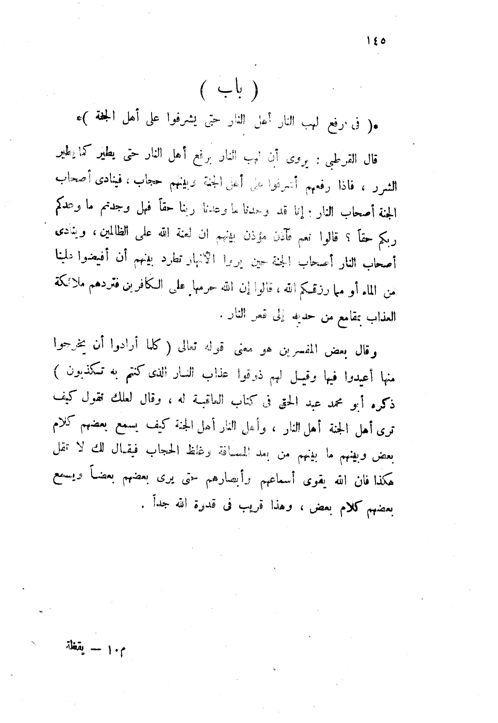 وَقَالَ بعض الْمُفَسّرين هُوَ معنى قَوْله تَعَالَى كلما أَرَادوا أَن يخرجُوا مِنْهَا أعيدوا فِيهَا وَقيل لَهُم ذوقوا عَذَاب النَّار الذى كُنْتُم بِهِ تكذبون ذكره أَبُو مُحَمَّد عبد الْحق فى كتاب الْعَاقِبَة لَهُ وَقَالَ لَعَلَّك تَقول كَيفَ ترى أهل الْجنَّة أهل النَّار وَأهل النَّار أهل الْجنَّة كَيفَ يسمع بَعضهم كَلَام بعض وَبينهمْ مَا بَينهم من بعد الْمسَافَة وَغلظ الْحجاب فَيُقَال لَك لَا تقل هَكَذَا فان الله يقوى أسماعهم وابصارهم حَتَّى يرى بَعضهم بَعْضًا وَيسمع بَعضهم كَلَام بعض وَهَذَا قريب فى قدرَة الله جدا