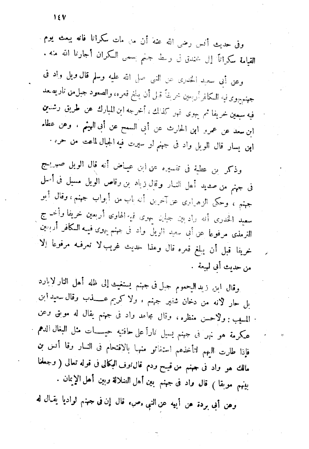 وَعَن أَبى سعيد الخدرى عَن النبى صلى الله عَلَيْهِ وَسلم قَالَ ويل وَاد فى جَهَنَّم يهوى فِيهِ الْكَافِر اربعين خَرِيفًا قبل أَن يبلغ قَعْره والصعود جبل من نَار يصعد فِيهِ سبعين خَرِيفًا ثمَّ يهوى فَهُوَ كَذَلِك أخرجه ابْن الْمُبَارك عَن طَرِيق رشدين ابْن سعد عَن عَمْرو ابْن الْحَارِث عَن أَبى السَّمْح عَن أَبى الْهَيْثَم وَعَن عَطاء ابْن يسَار قَالَ الويل وَاد فى جَهَنَّم لَو سيرت فِيهِ الْجبَال لماعت من حره