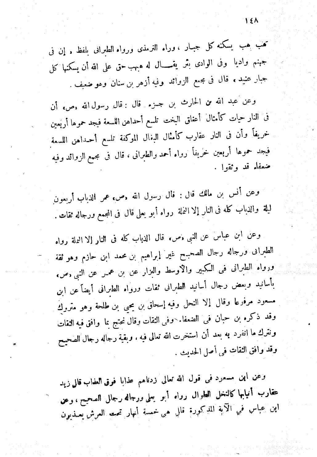 وَعَن عبد الله بن الْحَارِث بن جُزْء قَالَ قَالَ رَسُول الله صلى الله عَلَيْهِ وَسلم أَن فى النَّار حيات كأمثال أَعْنَاق البخت تلسع أحداهن اللسعة فيجد حموها أَرْبَعِينَ خَرِيفًا وَأَن فى النَّار عقارب كأمثال البغال الموكفة تلسع أحداهن اللسعة فيجد حموها أَرْبَعِينَ خَرِيفًا رَوَاهُ أَحْمد والطبرانى قَالَ فى مجمع الزَّوَائِد وَفِيه ضعفاء قد وثقوا