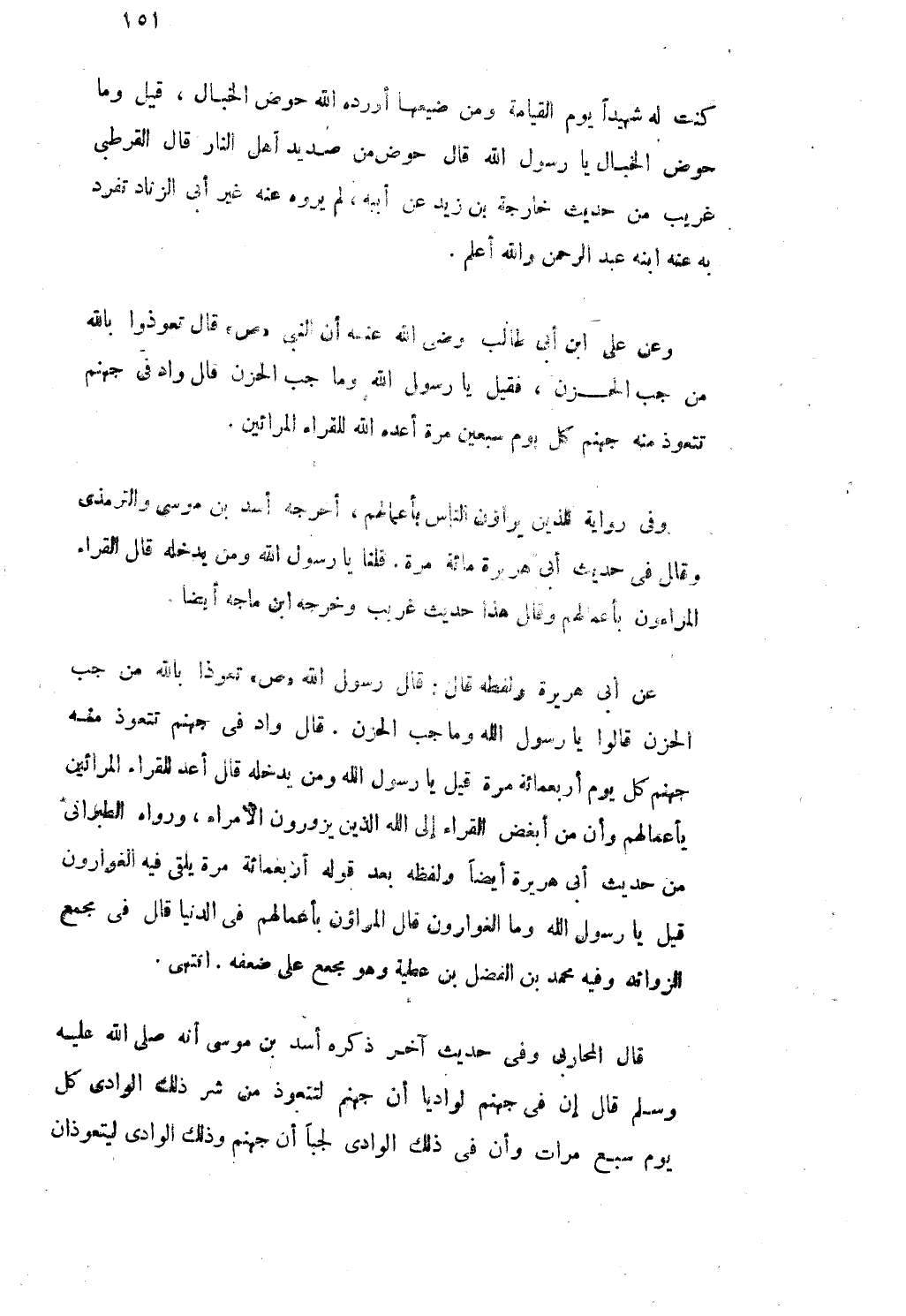 وَعَن على ابْن أَبى طَالب رضى الله عَنهُ أَن النبى صلى الله عَلَيْهِ وَسلم قَالَ تعوذوا بِاللَّه من جب الْحزن فَقيل يَا رَسُول الله وَمَا جب الْحزن قَالَ وَاد فى جَهَنَّم تتعوذ مِنْهُ جَهَنَّم كل يَوْم سبعين مرّة أعده الله للقراء المرائين