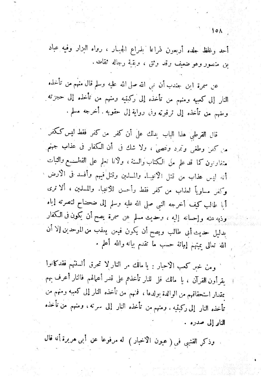 قَالَ القرطبى هَذَا الْبَاب يدلك على أَن كفر من كفر فَقَط لَيْسَ ككفر من كفر وطغى وتمرد وَعصى وَلَا شكّ فى أَن الْكفَّار فى عَذَاب جَهَنَّم متفاوتون كَمَا قد علم من الْكتاب وَالسّنة ولأنا نعلم على الْقطع والثبات أَنه لَيْسَ عَذَاب من قتل الْأَنْبِيَاء وَالْمُسْلِمين وَقتل فيهم وأفسد فى الأَرْض وَكفر مُسَاوِيا لعذاب من كفر فَقَط وَأحسن للأنبياء وَالْمُسْلِمين أَلا ترى ابا طَالب كَيفَ أخرجه النبى صلى الله عَلَيْهِ وَسلم إِلَى ضحضاح لنصرته إِيَّاه وذبه عَنهُ وإحسانه إِلَيْهِ وَحَدِيث مُسلم عَن سَمُرَة يَصح أَن يكون فى الْكفَّار فى الْكفَّار بِدَلِيل حَدِيث ابى طَالب وَيصِح أَن يكون فِيمَن يعذب من الْمُوَحِّدين إِلَّا أَن الله تَعَالَى يميتهم إماتة حسب مَا تقدم بَيَانه وَالله أعلم